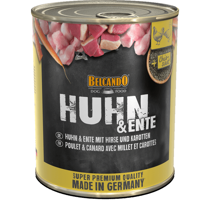 BELCANDO - Pâtée POULET & CANARD avec Millet & Carottes est un aliment complet pour chiens adultes, composé de morceaux de viande soigneusement cuits.